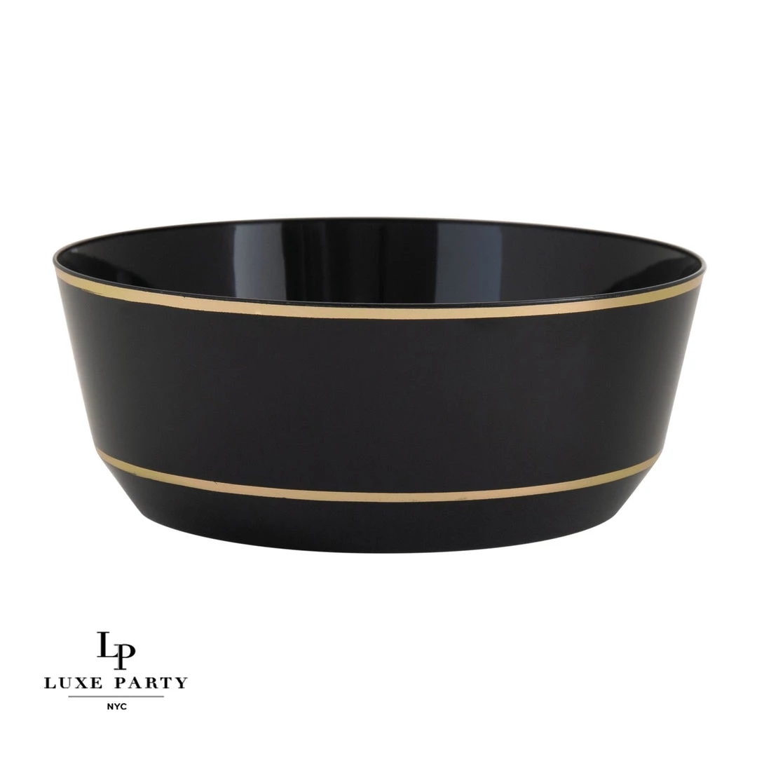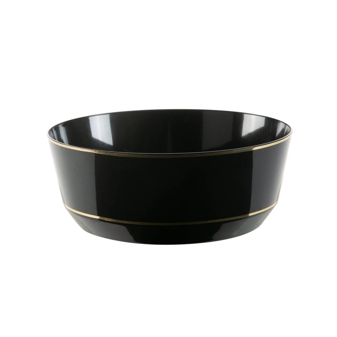 Part of the Round Coupe Collection, this disposable heavy-duty plastic black bone china dinner bowls is decorated with luminous gold accents along the upper and lower borders,that elevate meals and parties from casual to elaborate.