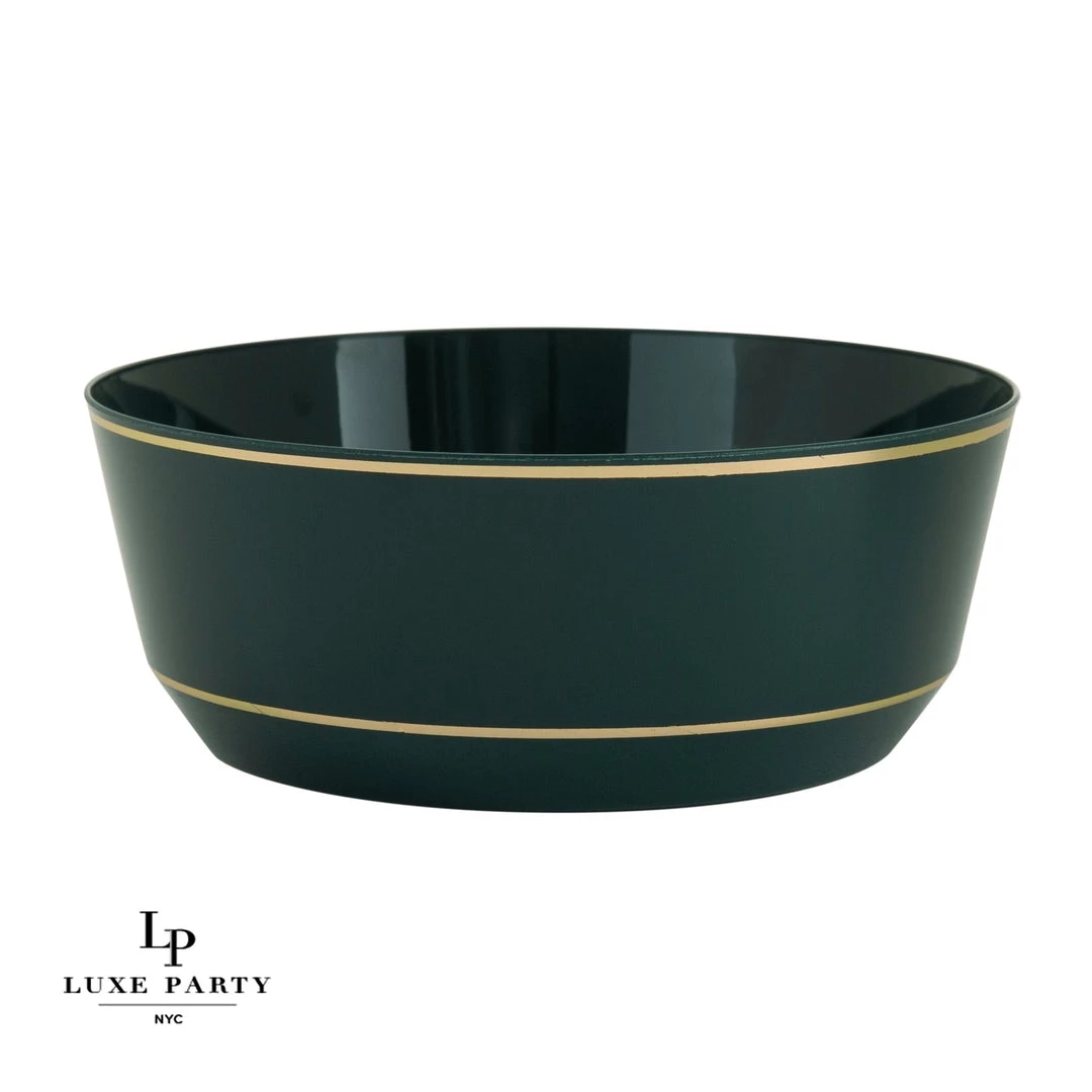 Part of the Round Coupe Collection, this disposable heavy-duty plastic emerald bone china dinner bowls is decorated with luminous gold accents along the upper and lower borders,that elevate meals and parties from casual to elaborate.