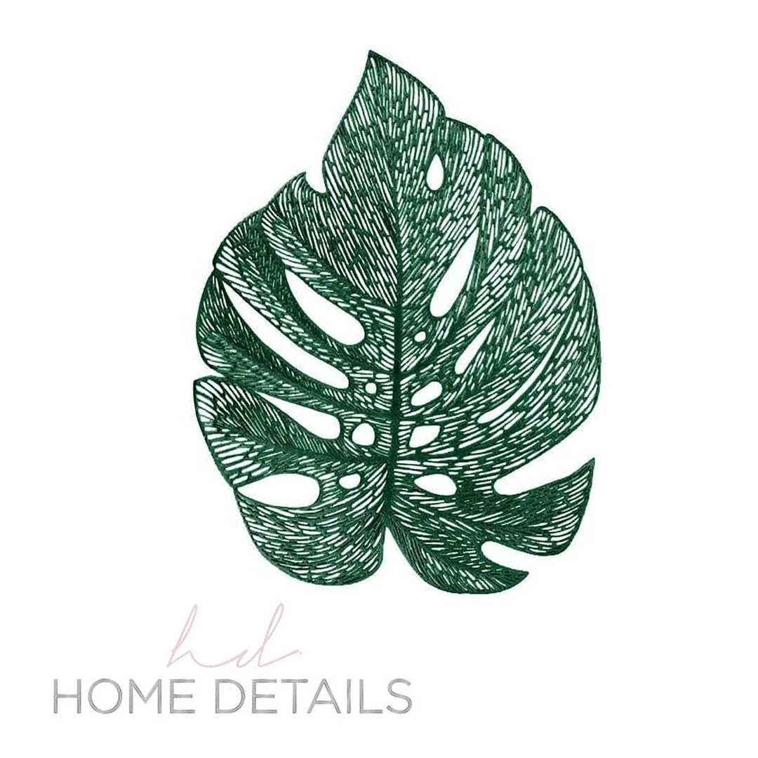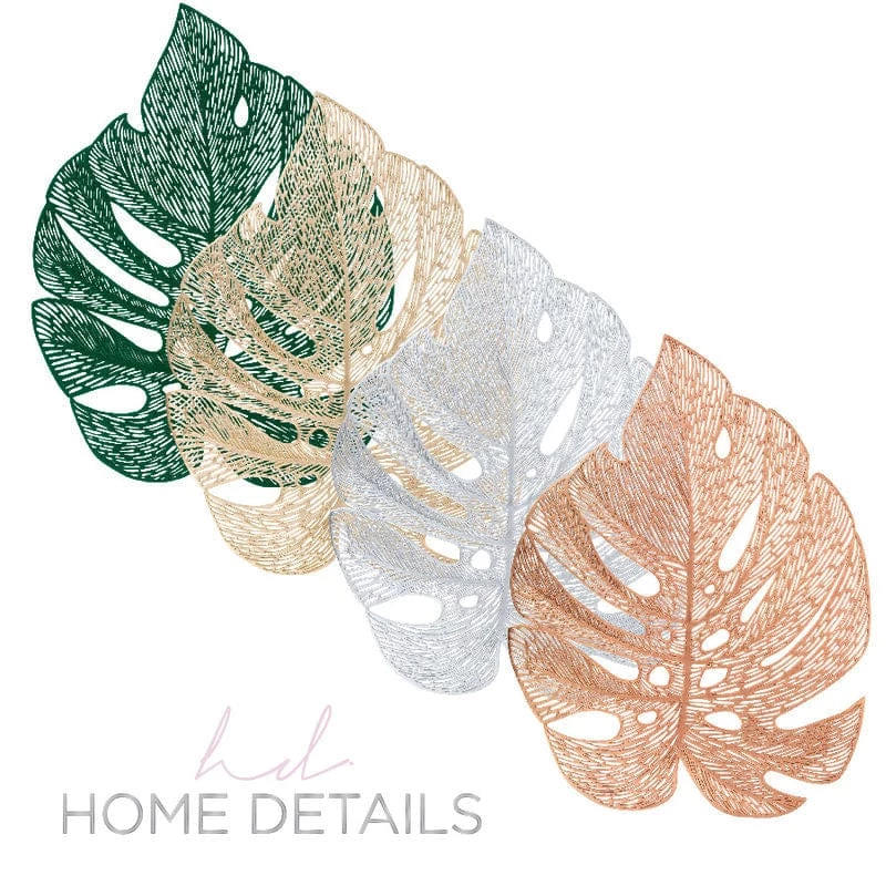 Add the finishing touch to your dining room table with the Home Details Leaf Shape Placemat. The unique and glamorous design will add the right touch to help elevate your place settings. These placemats are perfect for your holiday and dinner parties. Create a picture-perfect place setting to impress your guests. The durable PVC material is long lasting and will protect your table from scratches. When done using, they are easy to clean by wiping them down with a cloth. No kitchen table setting is complete without the Home Details Placemats.
